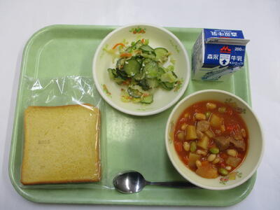 米粉入り人参パン、牛乳、ポークビーンズ、ナッツサラダ