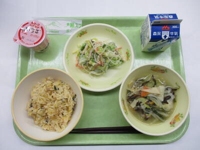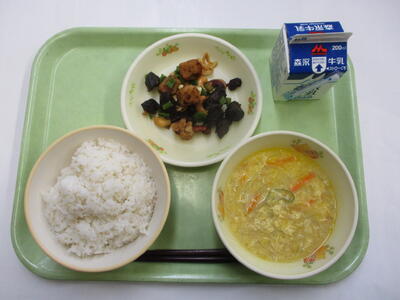 今日は馬肉の日です。御船町からいただいた馬肉を蓮根と一緒に炒めました。ごはんにもよく合う一品です。また、今日は「のりの日」なので、味付けのりをつけました。のりは少しの量でもビタミンやミネラルがたくさん含まれていて、疲れを回復させたり、美しい肌や爪、髪の毛をつくったり、貧血予防などにも効果があります。のりでごはんを上手に包んで食べましょう。