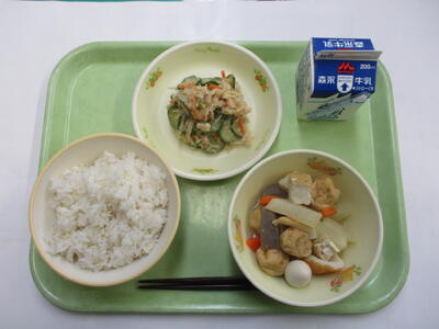 麦ごはん、牛乳、みそ煮込みおでん、切り干し大根の酢の物