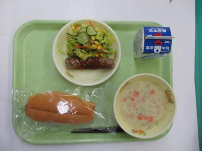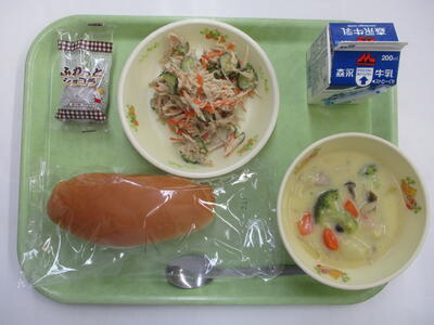 コッペパン、牛乳、クリームシチュー、ごぼうサラダ、チョコ大福