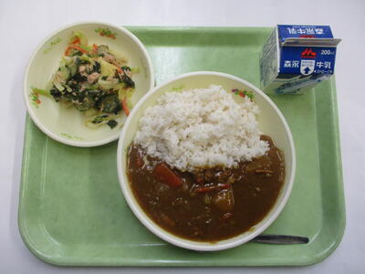 カレーライス、牛乳、わかめとツナのごまサラダ