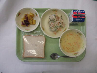 パンにツナマヨサラダをはさんで、サンドイッチを作りましょう。今日はサンドイッチを主食にした洋風ランチメニューです。パンは一口ずつ手でちぎって食べるのが正しいマナーですが、サンドイッチはそのままかぶりついてもマナー違反になりません。今日はさつま芋をキャラメルソースでからめたデザートもつけました。