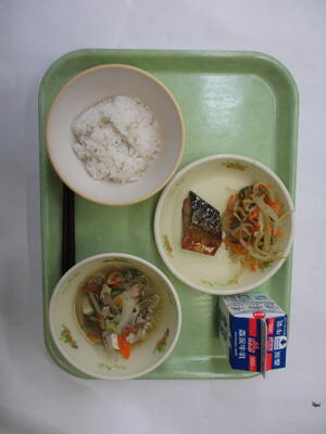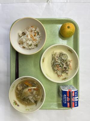 今日は和歌山県の郷土料理や特産物を入れた給食です。「かきまぶり」は「かき混ぜる」という意味の方言で、来客が多いときに大量につくられるそうです。僧兵汁はにんにくやしょうががアクセントとなった寒い季節にぴったりのお汁です。また、和歌山県では紀州南高梅が有名で生産量日本一です。今日のサラダには紀州梅を使いました。和歌山県は温州みかんもたくさんつくられていますよ。