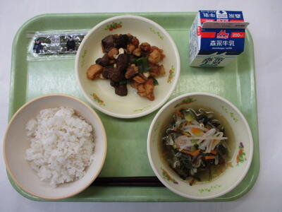 レバーは栄養をためておく肝臓のことです。栄養がたくさん含まれているので成長期のみなさんには意識して食べてほしい食材の一つです。今日はレバーがちょっと苦手な人も鶏肉と一緒に食べられたらいいなあと思います。具だくさんのスープとのり巻きごはんと交互に食べてください。