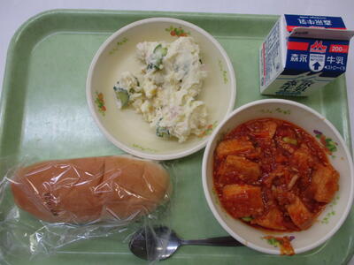 今日はごはんにタコライスの野菜をのせて、その上にお肉をのせて、混ぜ合わせて食べましょう。タコライスは給食でも人気メニューの一つです。ごはんに具をのせて食べるものは食べやすく、早く食べられるようですが、流しこまずに、一口ずつよく噛んで食べるようにしましょう。