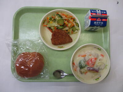 四季の変化がはっきりしている日本ですが、最近は季節の移り変わりがわかりにくくなってきていますね。しかし、給食ではできるだけ季節のものを取り入れていきますので、旬の食材を確認しながら食べてほしいと思います。今日は秋を感じるシチューをつくりました。きのこやさつま芋、さといもが入っていますよ。