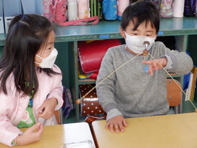 今回、地域の方よりいただいた手作りの「やじろべえ」を使って楽しく遊びました。人差し指でバランスを取りながら遊んだり、競争をしたりと思い思いに楽しく遊びました。後半は自分たちで作った凧をグランドで元気一杯に揚げました。
