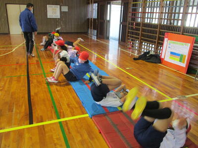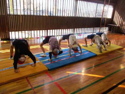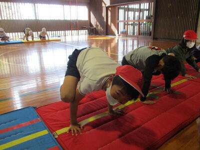「かえる跳び」「ゆりかご」「アンテナ」「肩倒立」「ブリッジ」「かえるバランス」「かえるの足打ち」「川跳び」など、様々な基礎的な技能に楽しく取り組んでいました。