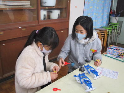 理科専科の先生が実際にしながら説明される様子を、子ども達は目を皿のようにして見ています。時計回りに100回巻く。巻いた銅線はきれいに寄せながら丁寧に巻いていく、などの注意点がありました。子ども達は友達同士でアドバイスしながら一生懸命に丁寧に、自分自身の銅線コイルを作っていました。これからの実験が楽しみです。