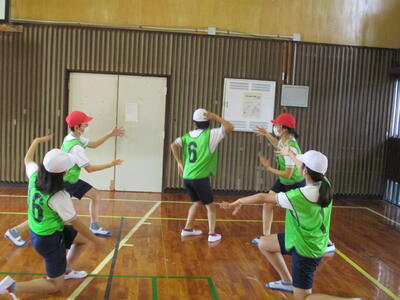6年体育は表現運動のダンスです。表現運動の大きなねらいは「心の開放」。6年生は4つのグループに分かれ、学習したステップをもとに、自分たちのテーマに合わせた創作ダンスを楽しみながらも発想力豊かに、仲間と協力して生み出していまいした。