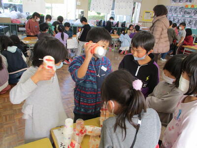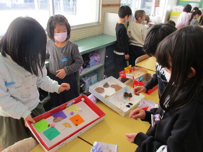 1年生の教室には、どんぐりや落ち葉、ペットボトルなどを使って作ったたくさんの遊びのコーナーがあり、2年生が楽しく遊びました。ボーリングやどんぐりコマ、やじろべえ、マラカス、魚釣りなど、1年生のアイディアがあふれていました。前回は2年生が1年生を招待しておもちゃランドで一緒に遊びました。仲良し1、2年生です。