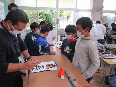 今日(4日)、5年生は書写の時間に毛筆の学習をしました。今回は、「成長」の字に挑戦しました。また、今回は毛筆が得意の2年生担任の松本先生をお招きして毛筆の書き方などを教えてもらいました。