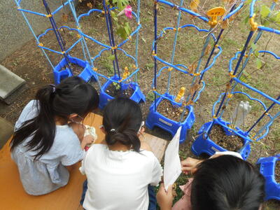 今日(2日)、1年生は生活「たねとりをしよう」の授業をしました。1学期に大切に育ててきたあさがおの種を観察した後、採取しました。