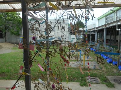 今日(7月7日)は、七夕の日です。1,2年は、願い事を書いた短冊を竹につけて飾っています。以前、ご紹介した1年生の図工「チョッキン パッで飾ろう」で作った作品も一緒に飾られています。