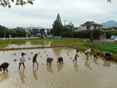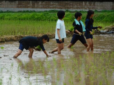 木倉小はどの学年も、地域の方のご協力のもと、様々な体験活動を行っています。3日(土)に、5年生はゲストティーチャーとして福島さんに教えていただきながら、学級PTA活動として、学校前の田んぼで「田植え」をしました。