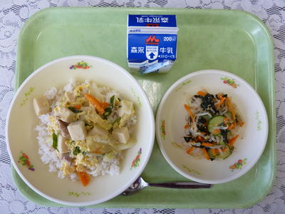 カレー豆腐、春雨のごま酢和え、麦ご飯、牛乳