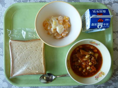 ポークビーンズ、フルーツヨーグルト、黒糖パン、牛乳