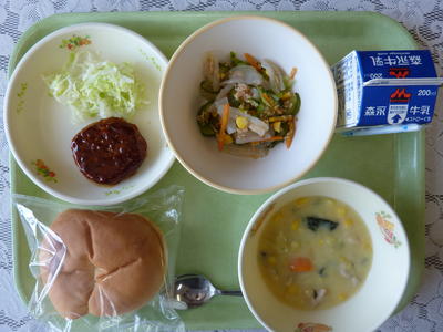 こんにゃくサラダ、コーンスープ、セルフバーガー、牛乳