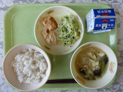 鶏団子スープ、茎ワカメの炒め煮、麦ご飯、牛乳
