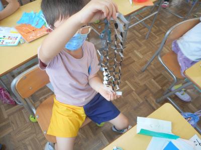 子どもたちは、好きな色の折り紙を折って、それを好きなようにハサミで切って、開いた時の模様を楽しんでいました。作った飾りは、七夕の願い事の短冊と一緒に笹に飾りました。