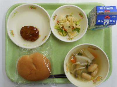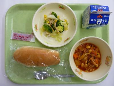 ブロッコリーのサラダ、ポークビーンズ、コッペパン、イチゴジャム、牛乳