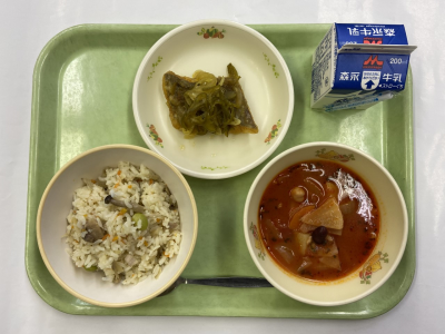 ごぼうピラフ、豆とトマトのスープ、魚のカレーマリネ、牛乳