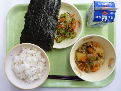 肉じゃが、キュウリの酢の物、焼き海苔、麦ご飯、牛乳