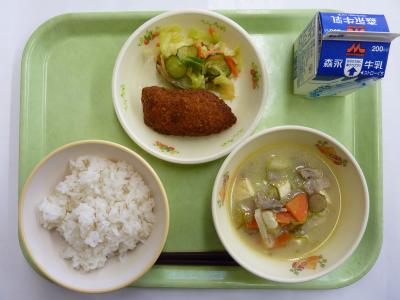 天草産真鯛のフライ、豚汁、キャベツの梅肉和え、麦ご飯、牛乳