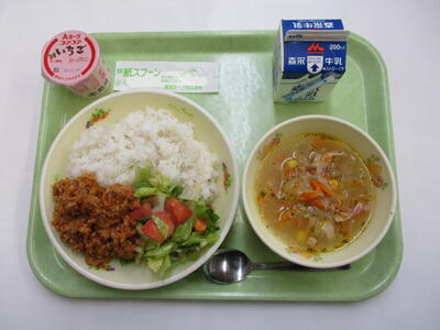 タコライス、牛乳、オニオンスープ、ヨーグルト