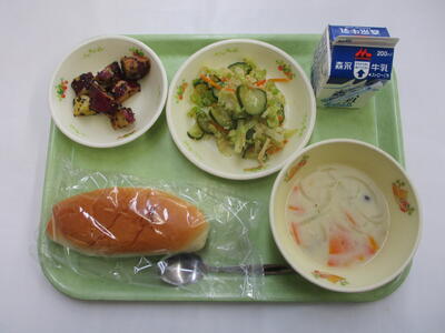 ミルクパン、牛乳、豆乳ビーンズスープ、もぐもぐサラダ、大学芋