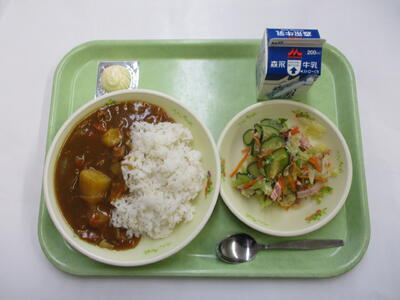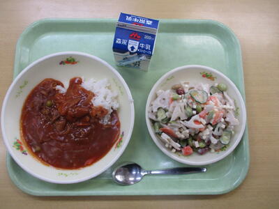 ポークカレーライス、牛乳、ハムサラダ、チーズ