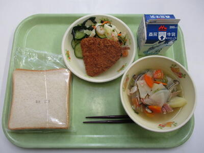 食パン、牛乳、野菜スープ、あじフライ、シーフードサラダ