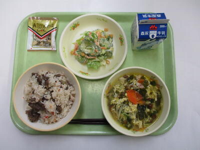 馬肉ピラフ、牛乳、きのこの卵のスープ、シーザーサラダ、いりこのアーモンド