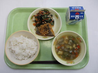 麦ごはん、牛乳、のっぺい汁、魚のアーモンドソースかけ、ひじきのサラダ