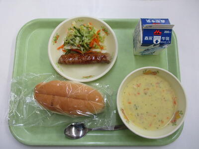 コッペパン、牛乳、コーンスープ、スティックハンバーグ、コールスロー