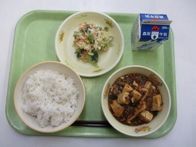 麦ごはん、牛乳、マーボー豆腐、チンゲン菜のごまサラダ