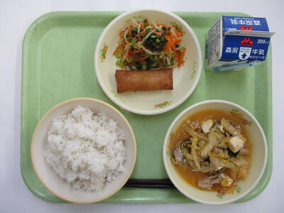 麦ごはん、牛乳、キムチスープ、春巻、小松菜の中華和え