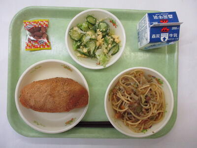 今日のサラダは緑の野菜をメインにしたサラダです。緑の野菜の中にたまごが入っていると黄色がきれいに映えますね。料理の美味しさや楽しさは味だけではなく、色や香り、食感や音などからも感じることができます。今日の給食も目で見て耳で聞いて楽しく食べてください。