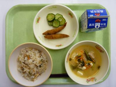 チゲ風スープ、きびなごカレーフライ、カリカリきゅうり、切り干し大根の混ぜご飯、牛乳
