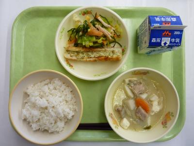 元気サラダ、竹輪のマヨネーズ焼き、豚汁、麦ご飯、牛乳