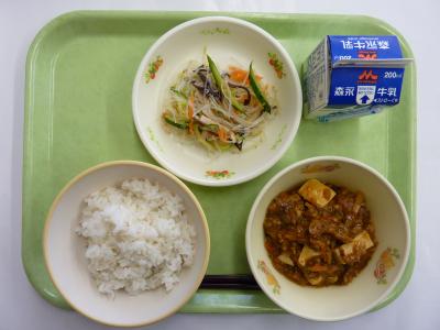 麻婆豆腐、バンサンスー、麦ご飯、牛乳