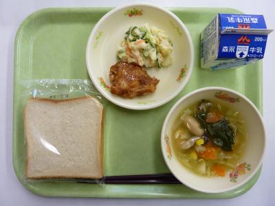 バーベキューチキン、ポテトサラダ、野菜スープ、食パン、牛乳