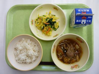 あか牛の牛丼、小松菜とたまごのサラダ、牛乳