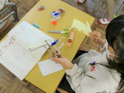 【学校生活】2年生国語「馬のおもちゃの作り方」 投稿日時 : 2021/11/02 学校サイト管理者 今日(2日)、2年生は国語「馬のおもちゃの作り方」の学習を行いました。順序を表す言葉を手がかりに説明文を読み取る力をつけることを目して、教科書を読みながら実際におもちゃを作りました。 子どもたちは、自分たちで考えながら制作に取り組んでいました。 Tweet {{options.likeCount}} {{options.likeCount}} {{options.unlikeCount}} {{options.unlikeCount}} 0 コメント
