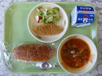 ミネストローネ、魚のカリカリフライ、フレンチサラダ、ミルクパン、牛乳