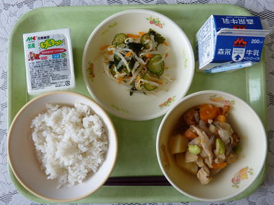 肉じゃがは煮物のなかでもみなさんに人気があります。肉じゃがの肉は牛肉が一般的ですが給食では豚肉を使っています。納豆は大豆の栄養である植物性タンパク質、カルシウム、ビタミンB2血食物せんいの他、納豆菌の働きでをさらさらにする成分が含まれます。