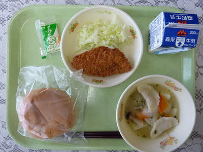国産の鶏肉と豚肉を使ったミートボールのケチャップ煮です。ミートボールの他にキャベツやタマネギ、じゃがいも、しめじなど多くの食材を使っているので栄養バランスがとれた献立です。食パンにはマーシャルビーンズ(チョコ大豆)やツナマヨサラダをはさんで食べます。
