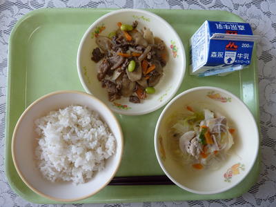 今日は馬肉給食の日です。馬肉の赤身を生姜、ごぼう、こんにゃく、にんじんと一緒に煮込んだ旨煮です。馬肉は脂肪分が少なく、タンパク質の他、牛や豚肉と比べて鉄分やカルシウムなどのミネラルをたくさん含んでいます。また、疲労回復効果があると言われているグリコーゲンを多く含んでいるのが特徴です。