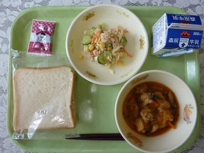 ミートボールのケチャップ煮、ツナマヨサラダ、マーシャルビーンズ、食パン、牛乳