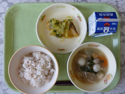 赤米ご飯、白玉汁、魚のカレーマリネ、牛乳